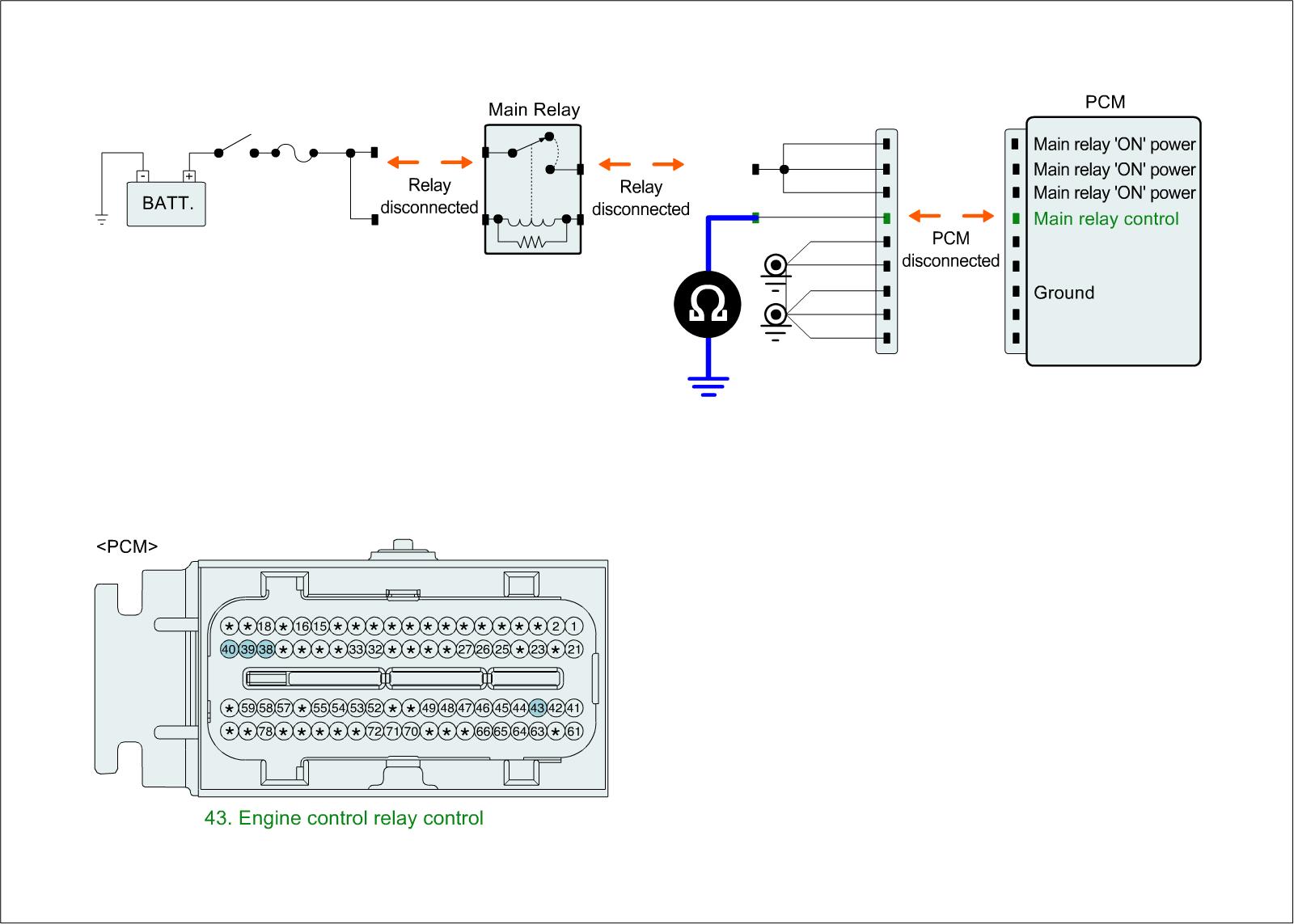 3. Measure the resistance between control terminal of main relay harness connector and chassis ground.