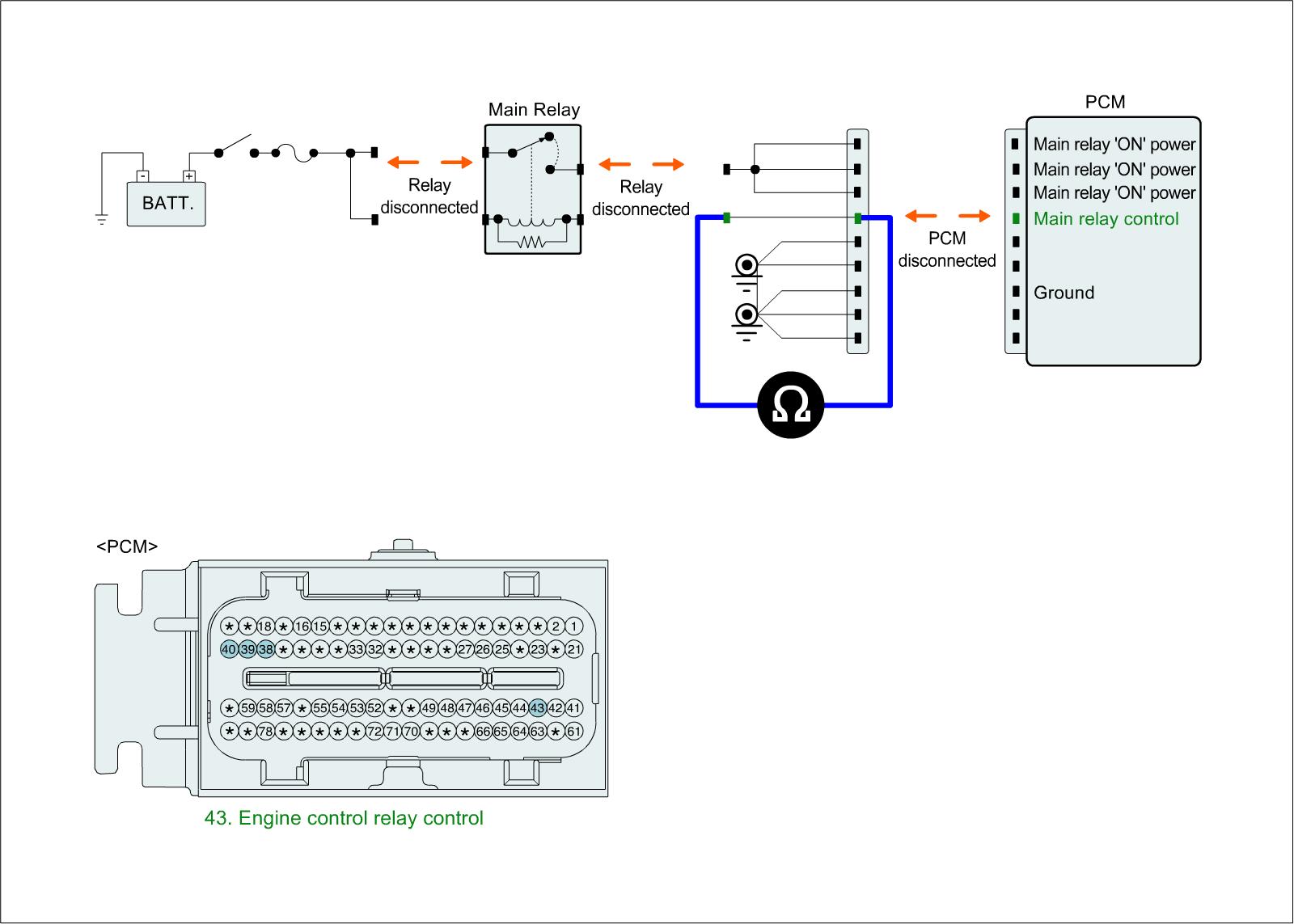 3. Measure the resistance between control terminal of main relay harness connector and main relay control terminal of PCM harness connector.