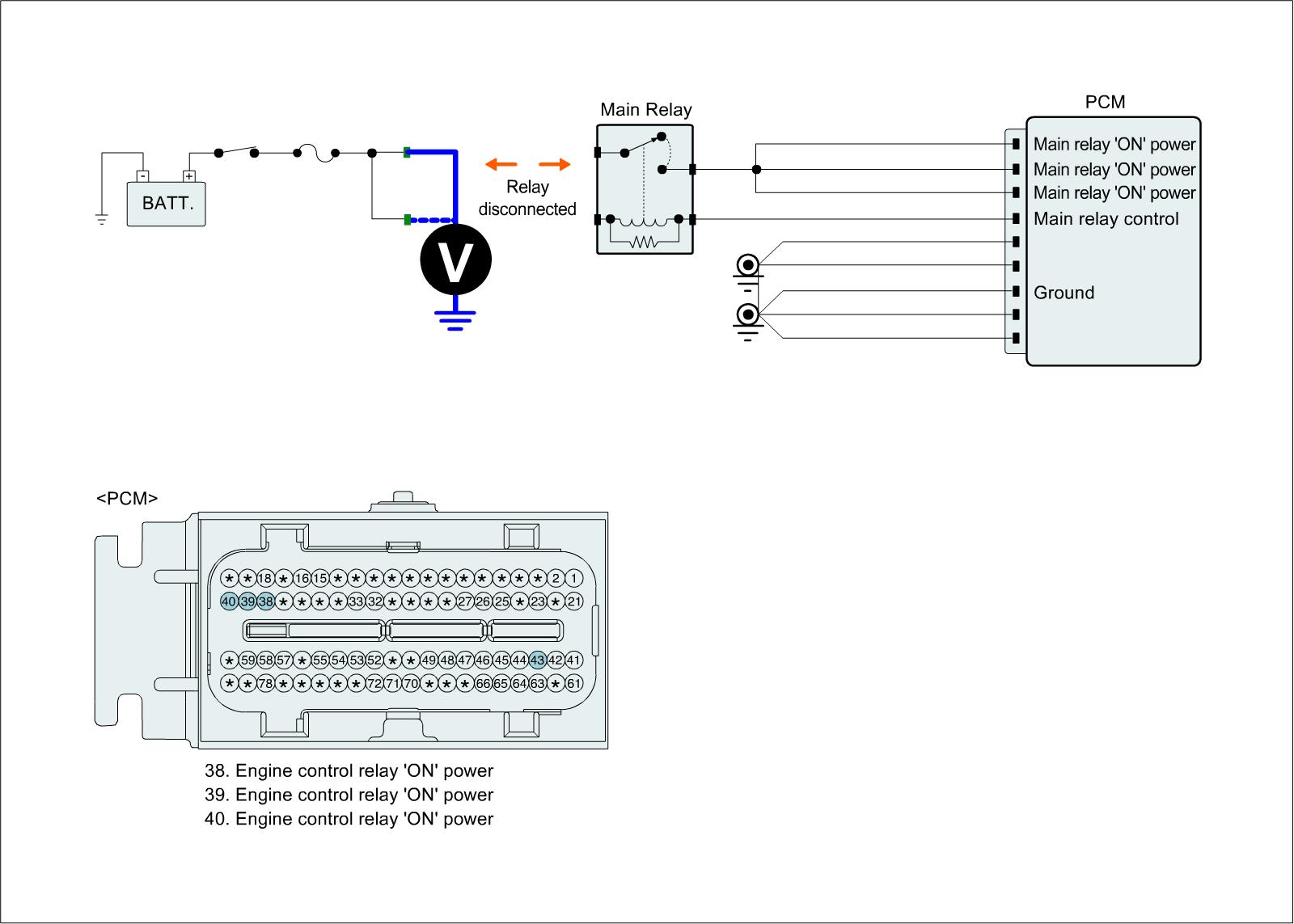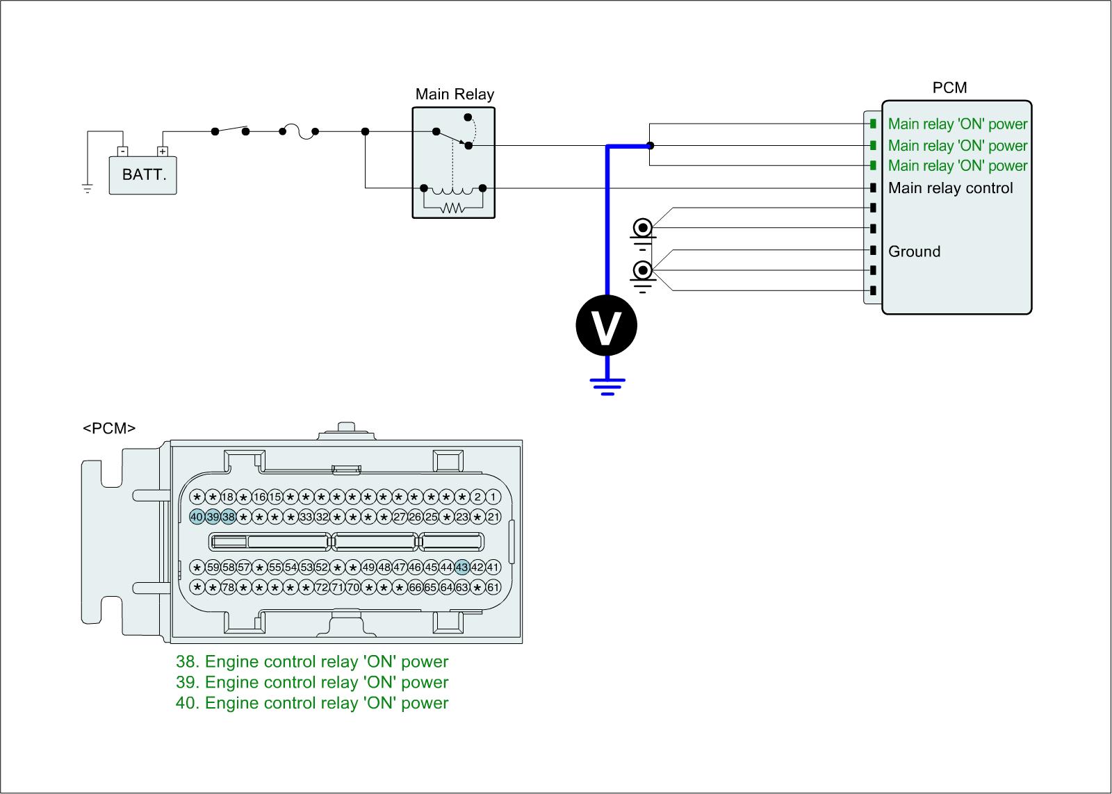 2. Measure the voltage between main relay "ON" power terminals of PCM harness terminal and chassis ground.