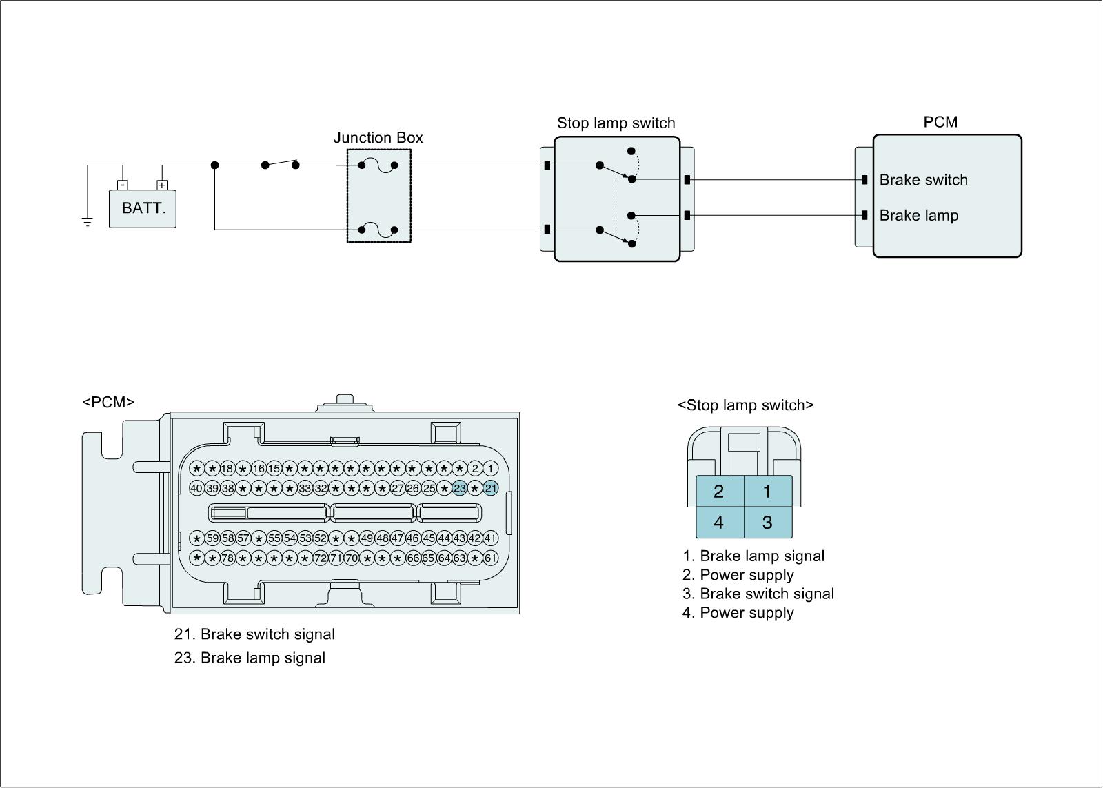Checking input signals from stop lamp switch under detecting condition, if the operation state of stop lamp switch does not change for more than 3 sec, PCM sets P0571. MIL (Malfunction Indication Lamp) turns on when the malfunction lasts till consecutive 2 driving cycle.