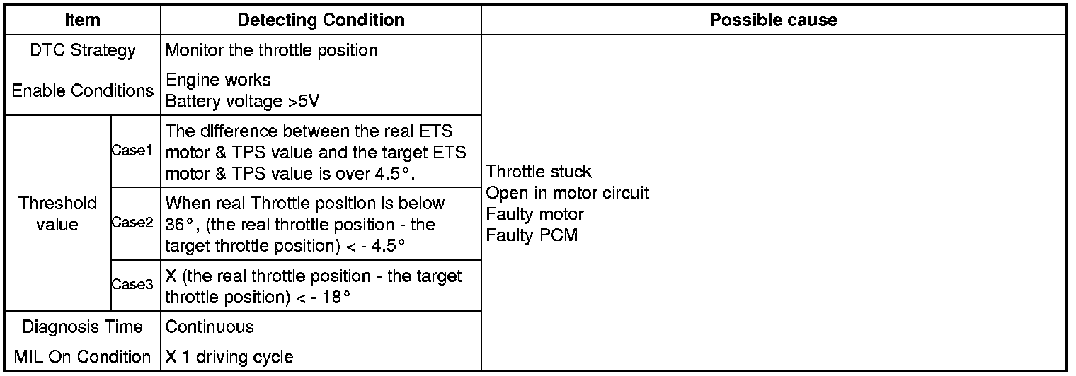 Checking output signals from TPS under detecting condition, if the difference between real and target throttle position is above the specified value, PCM sets P0638 and then MIL (Malfunction Indication Lamp) turns on.