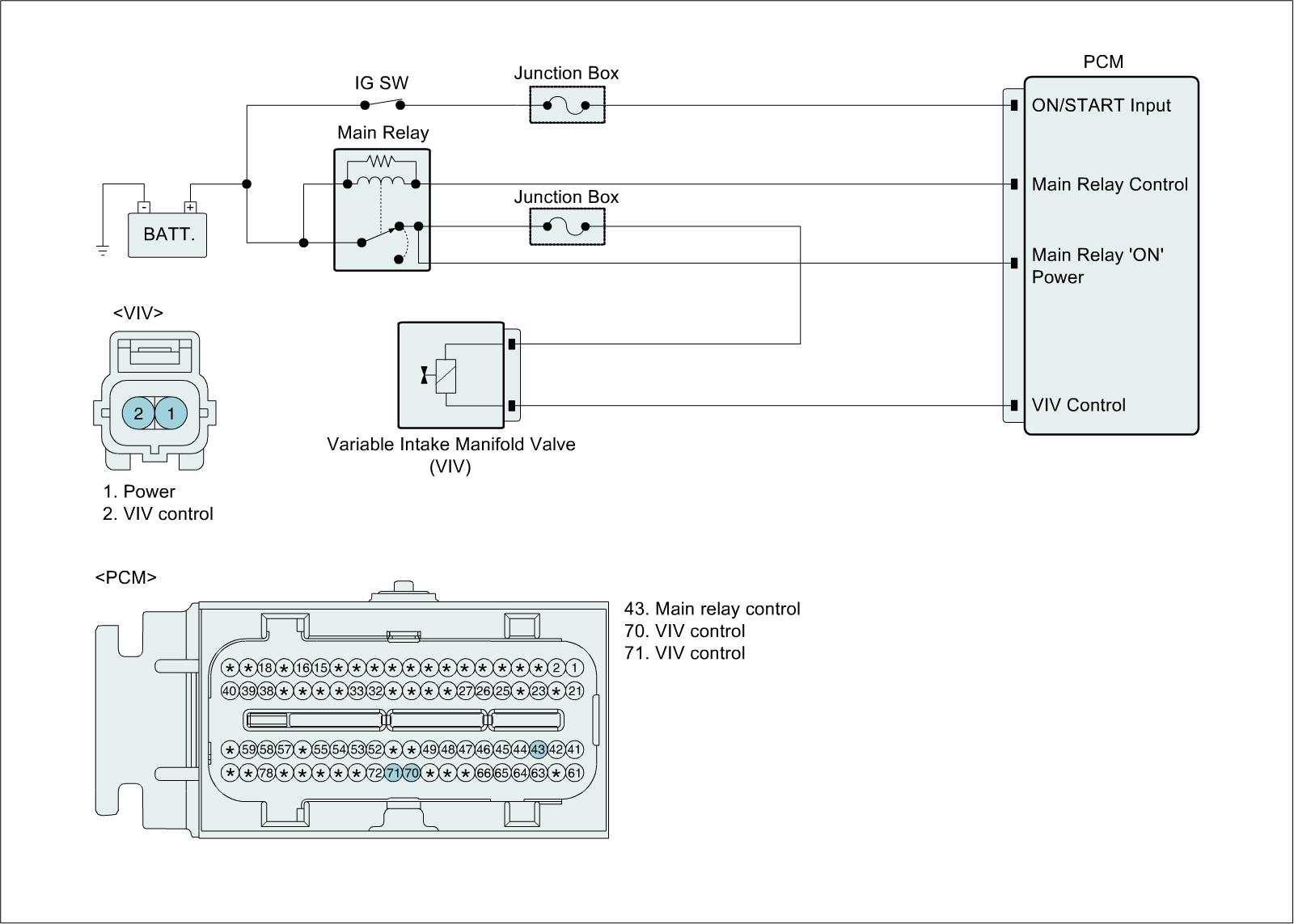 VIS (Variable intake system) is a device which varies the length of intake manifold to genetate maximum power at certain RPM. VIS lengthens intake manifold to improve the torque at low RPM when vehicle speed is low while it shortens intake manifold to raise torque at high RPM when vehicle speed is high. PCU controls VIS using RPM signal.