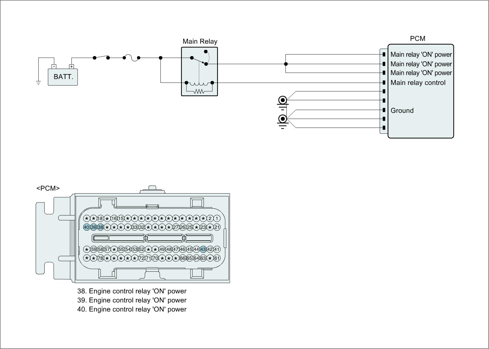 The PCM provides ground to one side of the coil of the main relay and the other side is connected to the battery. The PCM monitors battery voltage and the voltage after the main relay.