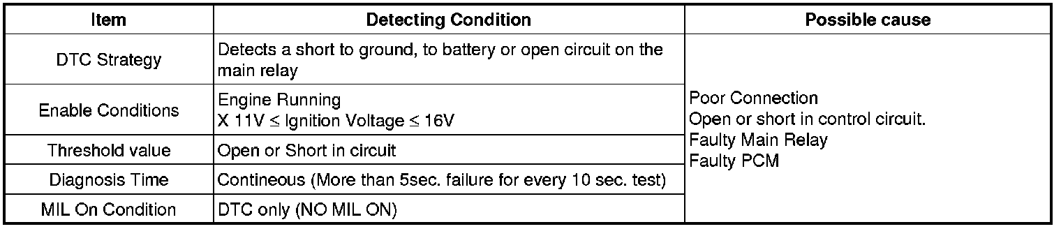 Checking the controlling state of main relay every 10 sec. under detecting condition, if open or short in the circuit is detected for more than 5 sec, PCM sets P0685.