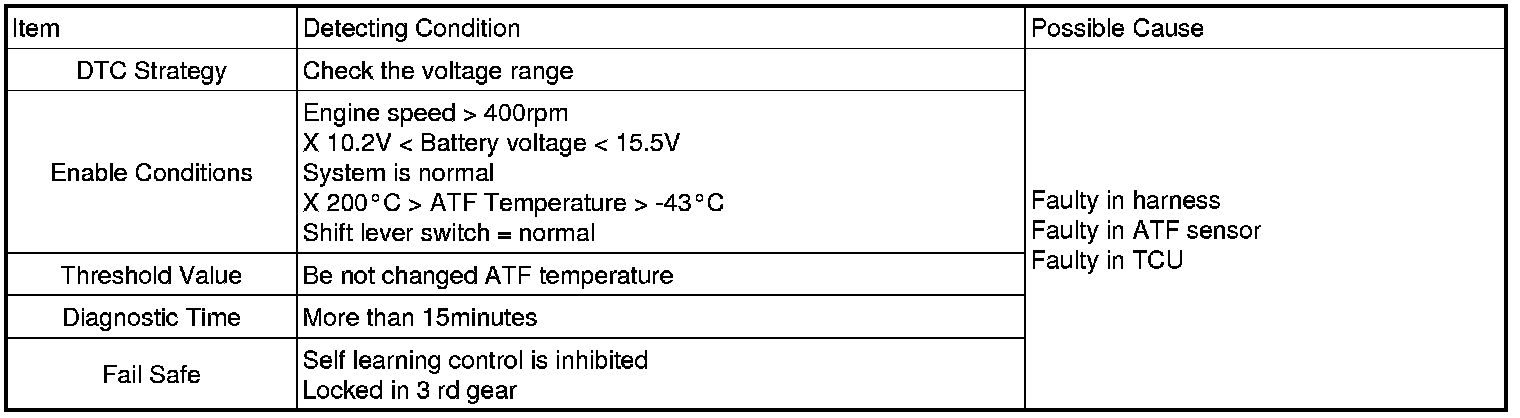 This DTC code is set when the ATF temperature output voltage is not changed for 15 minutes. The TCM regards the ATF temperature as fixed at a value of 80 °C.