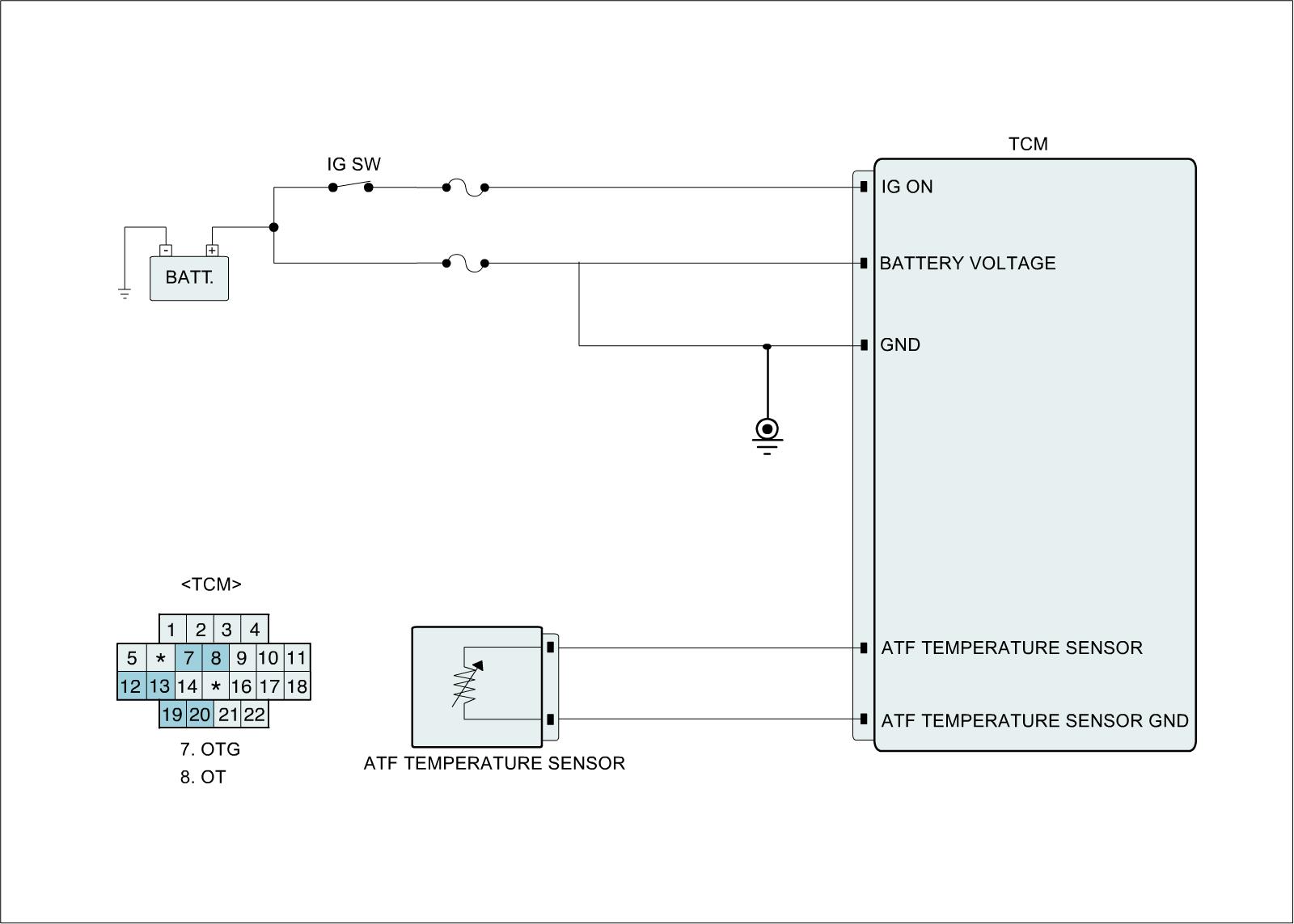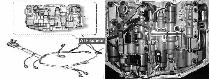 The automatic TRANSAXLE fluid (ATF) temperature sensor is installed in the Valve Body. This sensor uses a thermistor whose resistance changes according to the temperature changes. The TCM supplies a 5 V reference voltage to the sensor, and the output voltage of the sensor changes when the ATF temperature varies. The automatic TRANSAXLE fluid (ATF) temperature provides very important data for the TCM's control of the Torque Converter Clutch, and is also used for many other purposes.
