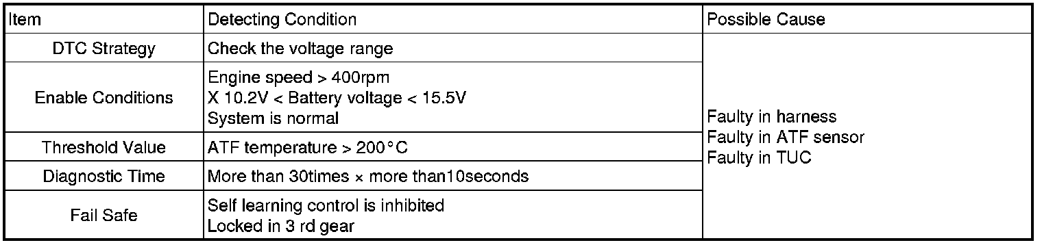 This DTC code is set when the ATF temperature output voltage is lower than a value generated by thermistor resistance, in a normal operating range, for approximately 1 second or longer. The TCM regards the ATF temperature as fixed at a value of 80 °C.