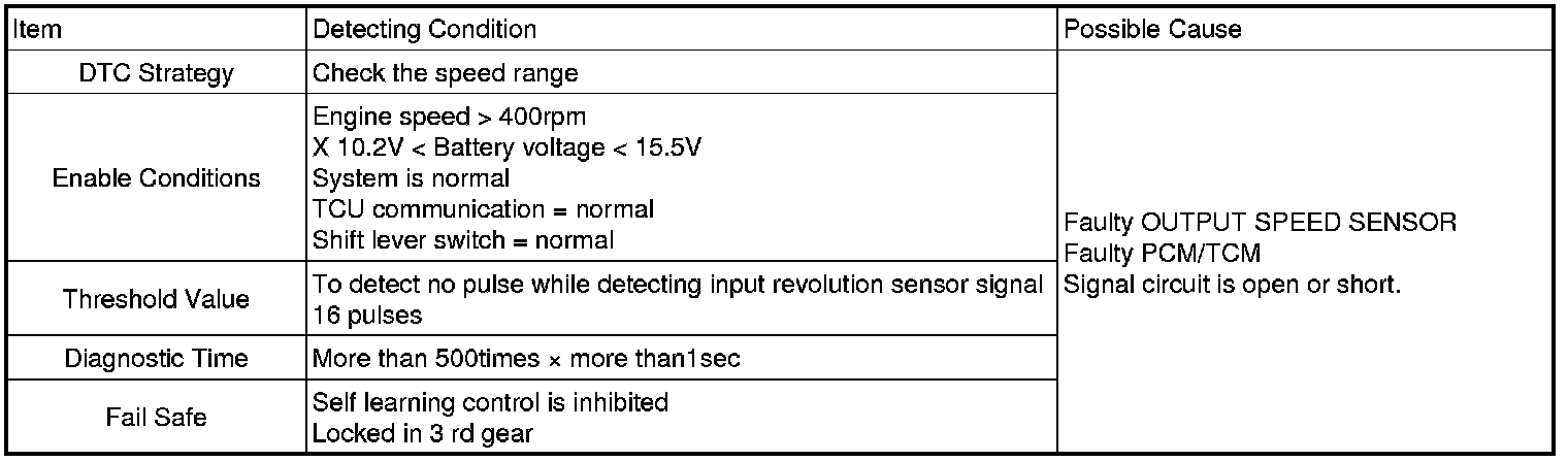 The TCM sets this code if the calculated value of the pulse-signal is noticeably different from the value calculated, using the Vehicle Speed Sensor output. The TCM will initiate the fail safe function if this code is detected.