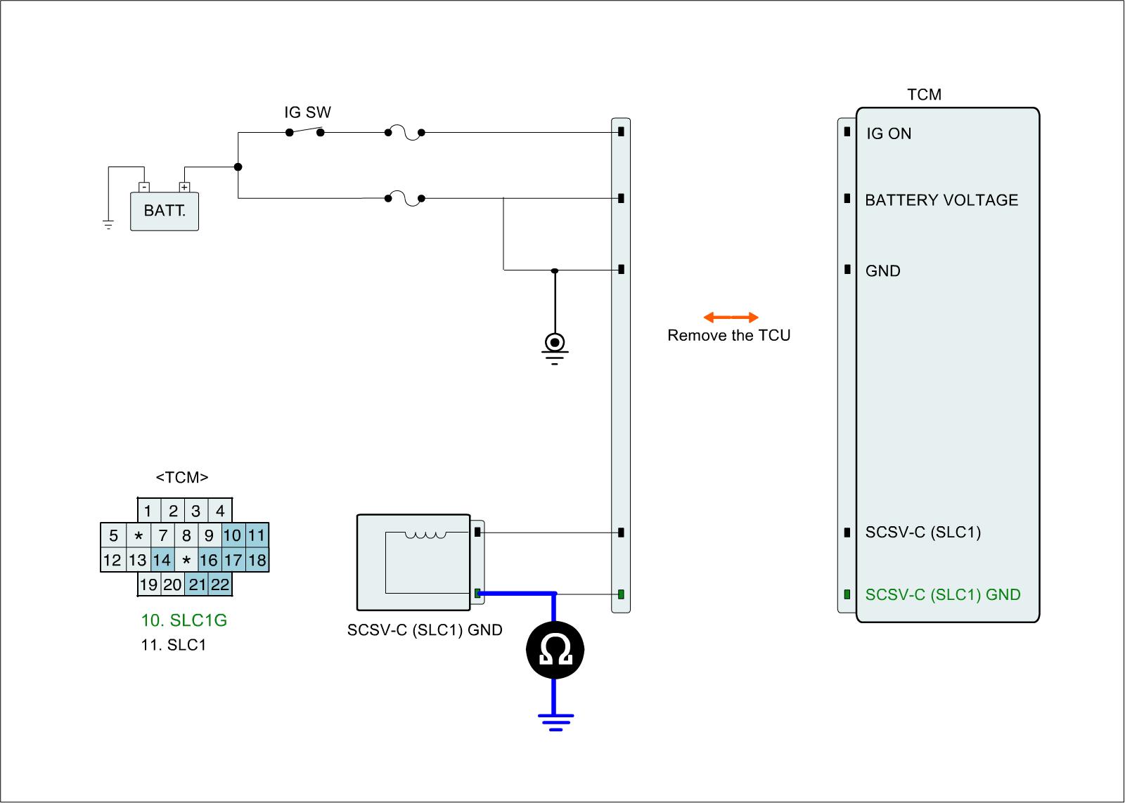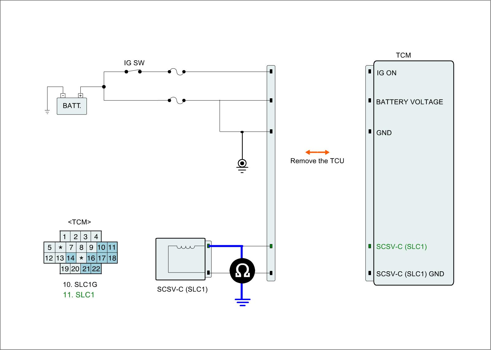 3. Perform the continuity test between Shift Solenoid "C"(SLC1) terminal and chassis ground.