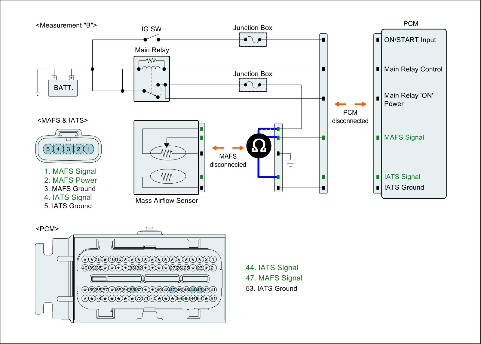 4. Measure resistance between signal terminal of IATS harness connector and ground terminal of MAFS harness connector. (Measurement "B")
