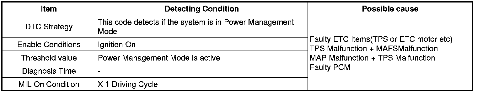 If power management mode is recognized under detecting condition, PCM sets P1295. And MIL (Malfunction Indication Lamp) turns on.