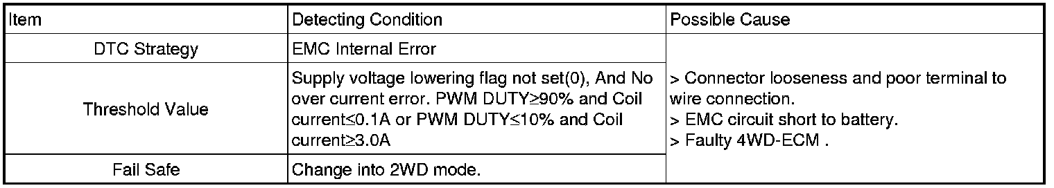 This DTC code is related to the EMC and is set If control harness has an short to battery source. If failure is detected "4WD-ECM" prohibits the "ITCC" control and vehicle is controlled with 2WD by intercepting EMC current.