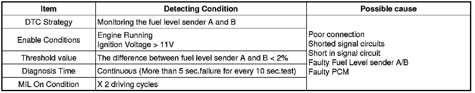 The Fuel Level Sensor (FLS) measures the fuel level in fuel tank and its information is used to supply the PCM with information regarding the monitoring condition of the EVAP canister purge system for leak detection. If the fuel level sensor is monitored for high or low stuck or difference between voltage of fuel level sensor and voltage deviation of fuel level sensor is exceeds limited value while driving, this is interpreted by the PCM as a fault.