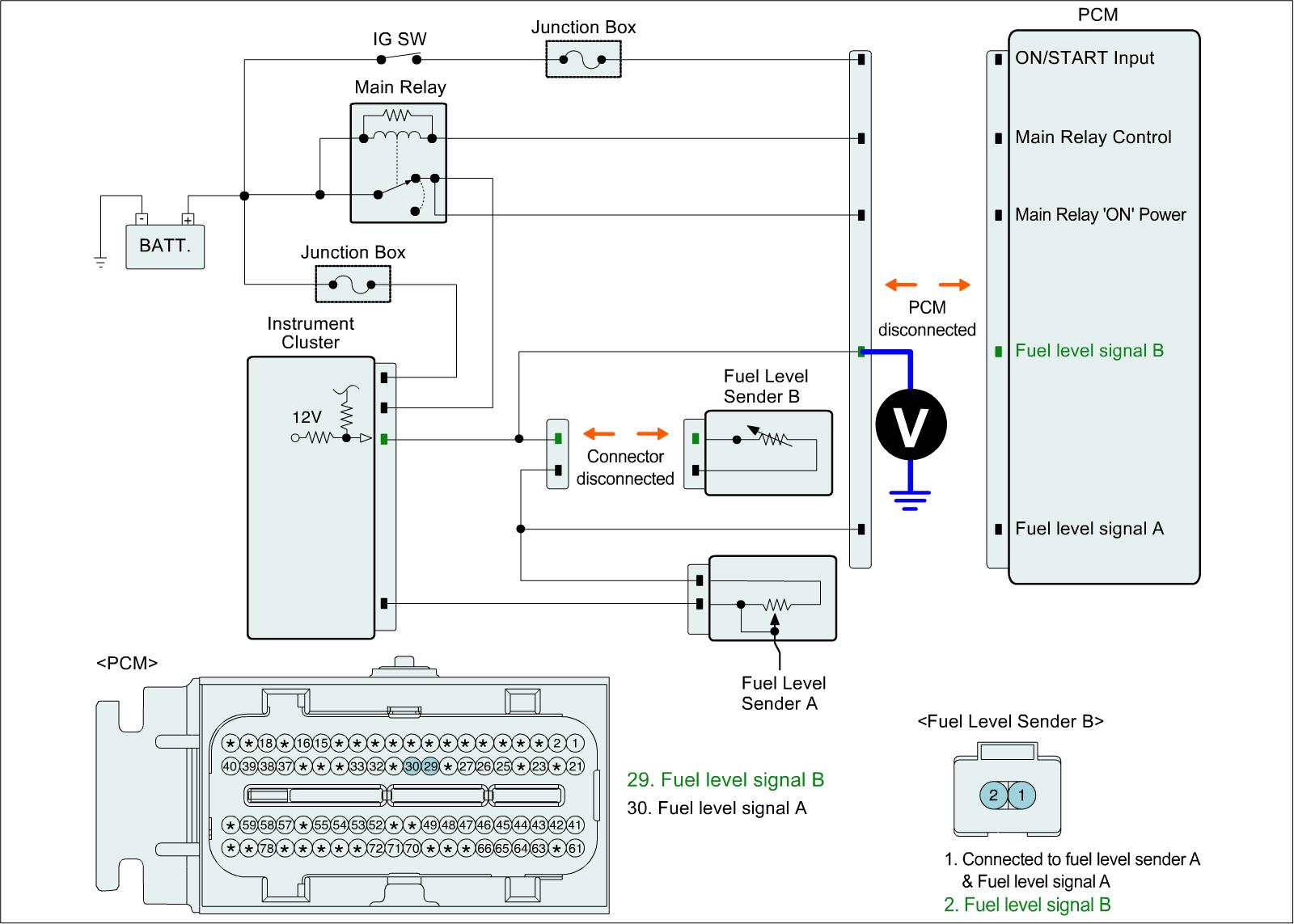 1. IG "OFF" and disconnect Fuel Level Sender B connector and PCM connector.