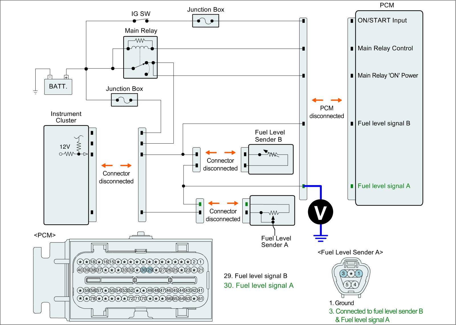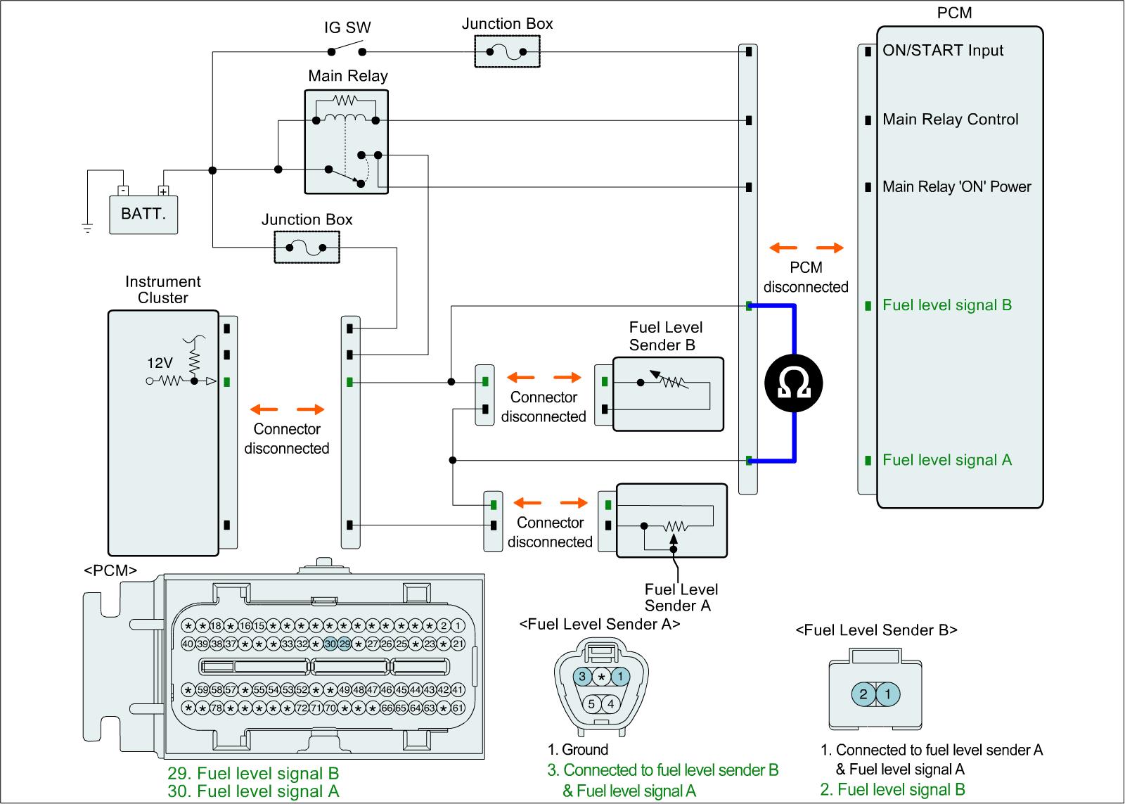 1. IG "OFF" and disconnect Instrument cluster connector, Fuel Level Sender A & Fuel Pump Motor connector, Fuel Level Sender B connector, and PCM connector.