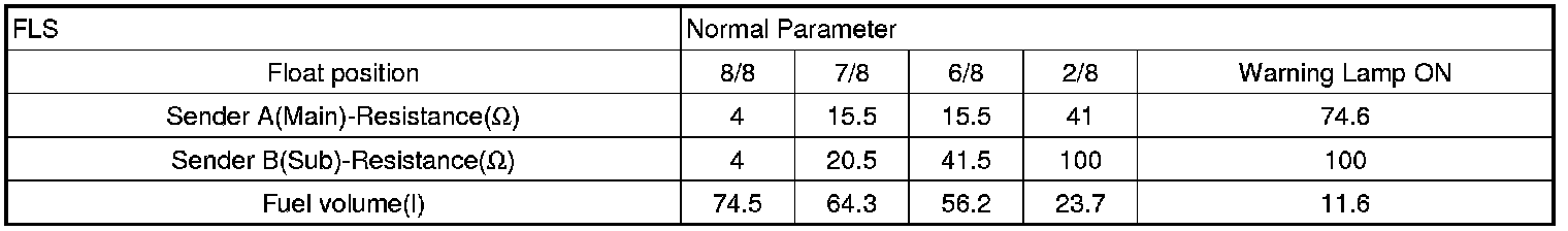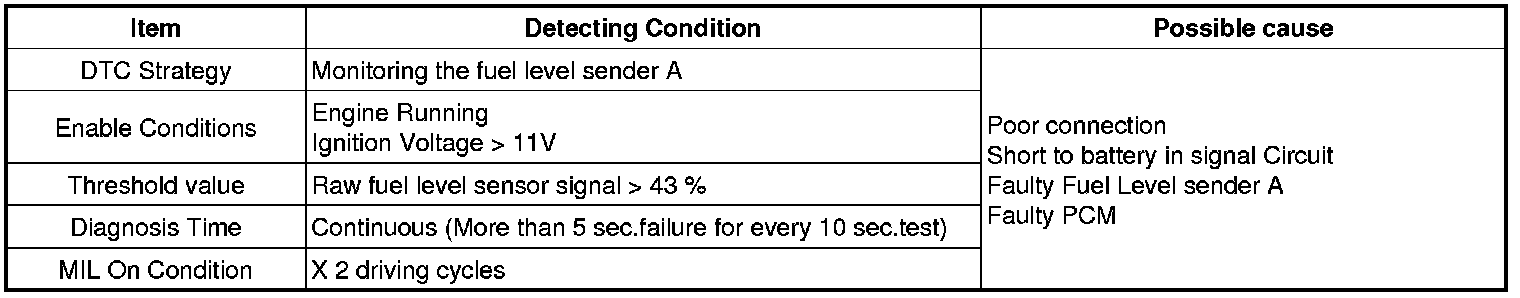 The Fuel Level Sensor (FLS) measures the fuel level in fuel tank and its information is used to supply the PCM with information regarding the monitoring condition of the EVAP canister purge system for leak detection. If the fuel level sensor is monitored for high or low stuck or difference between voltage of fuel level sensor and voltage deviation of fuel level sensor is exceeds limited value while driving, this is interpreted by the PCM as a fault.