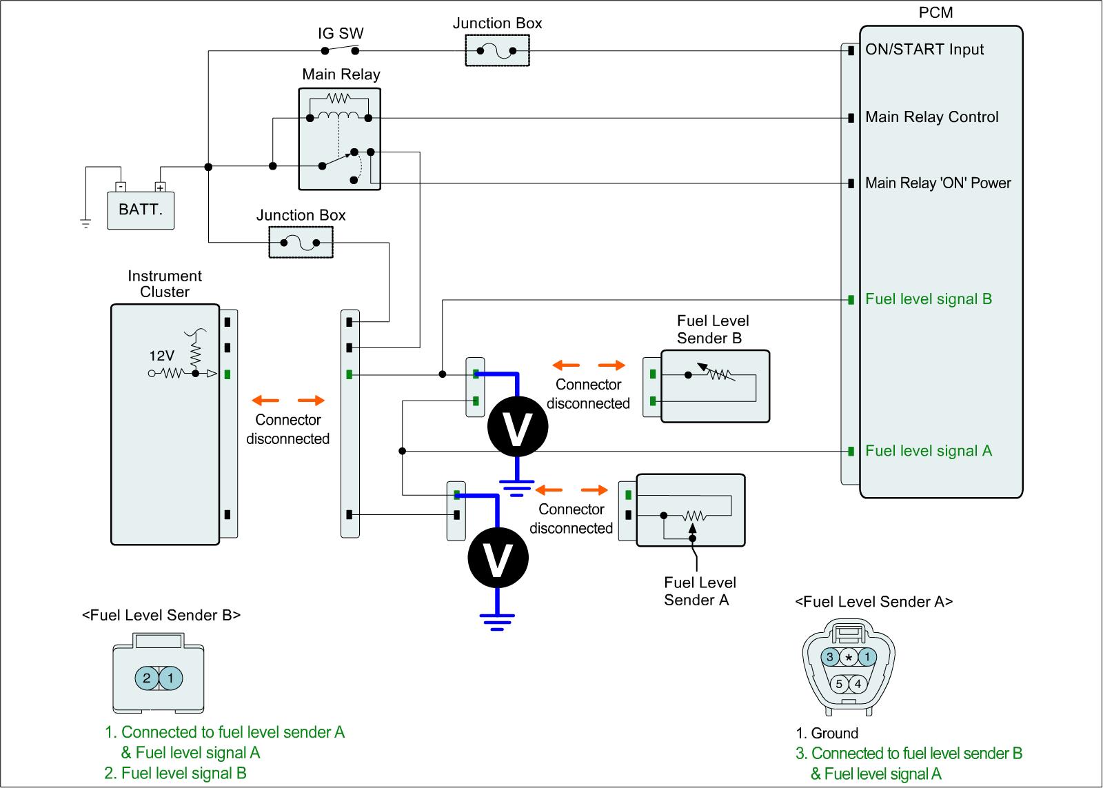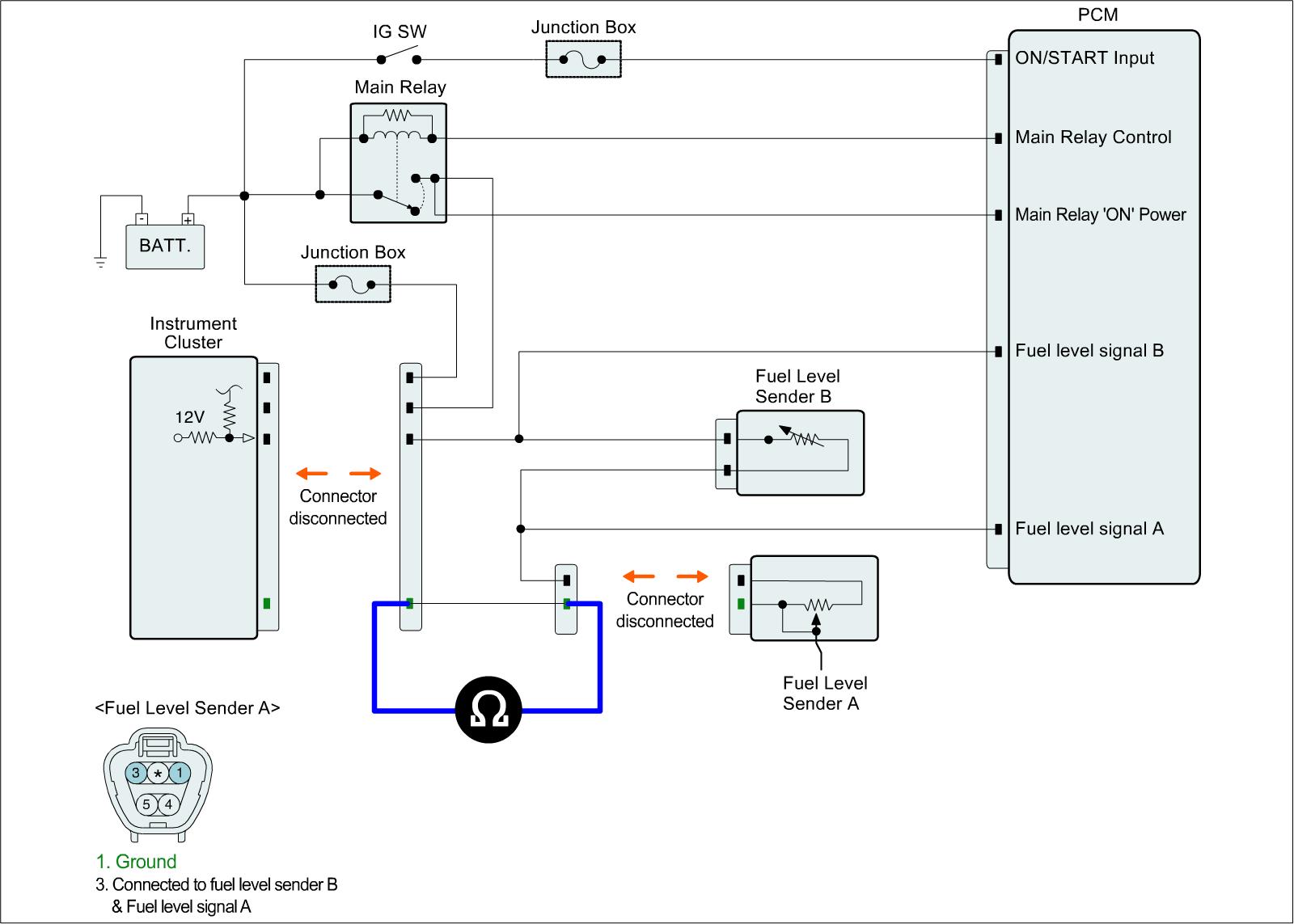 1. IG "OFF" and disconnect Instrument cluster connector, Fuel Level Sender A & Fuel Pump Motor connector, and Fuel level sender B connector.