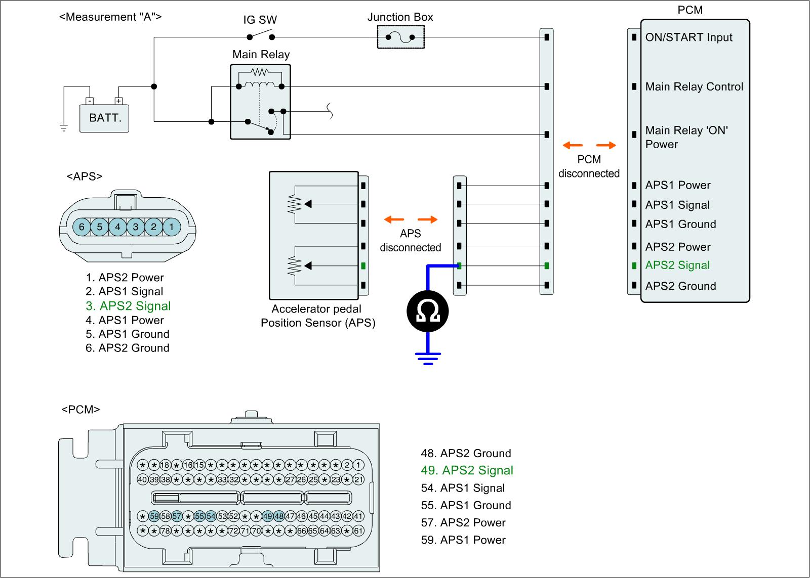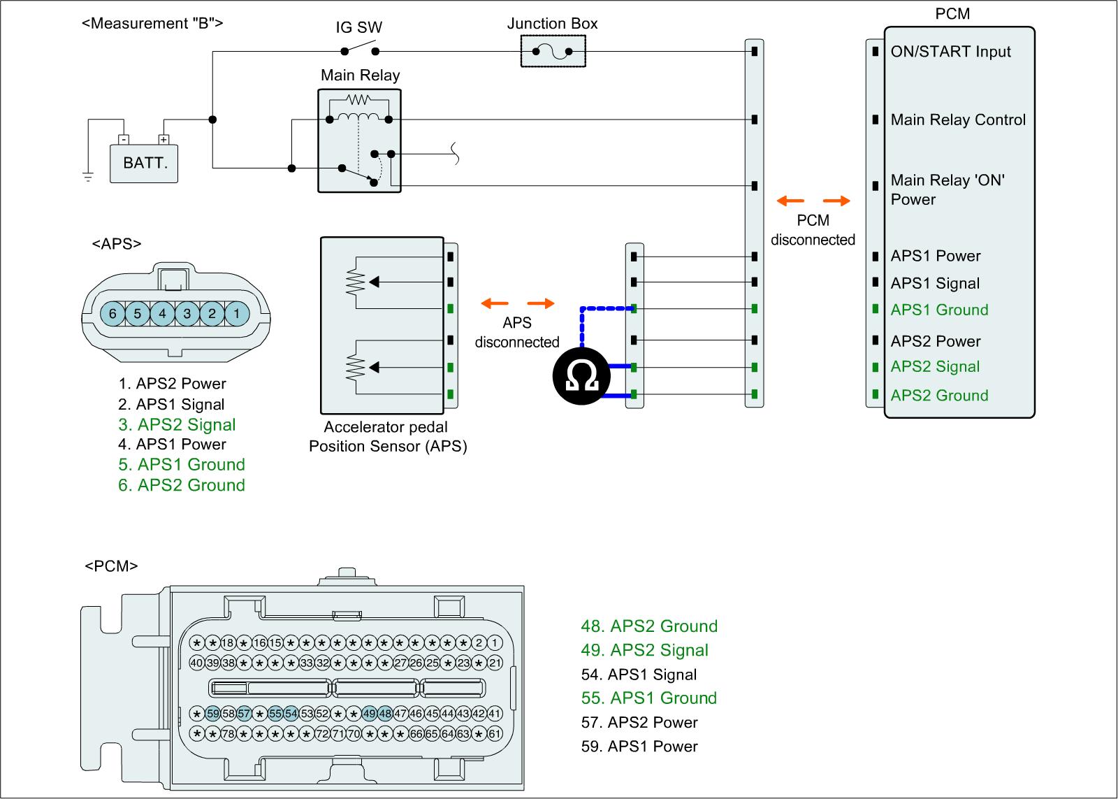 3. Measure resistance between APS 2 signal and APS 1 (2) ground terminals of APS harness connector. (Measurement "B")