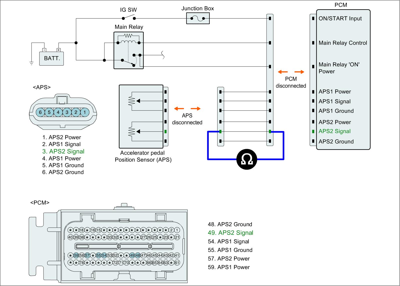 2. Measure resistance between APS 2 signal terminal of APS harness connector and APS 2 signal terminal of PCM harness connector.