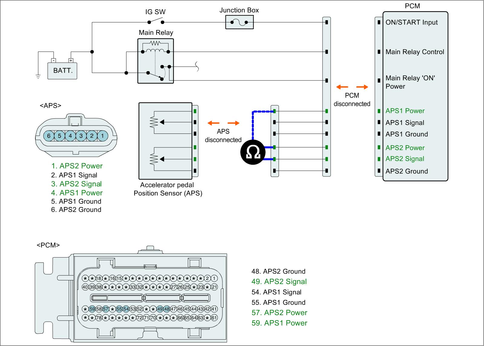 2. Measure resistance between APS 2 signal and APS 1 power terminals of APS harness connector.