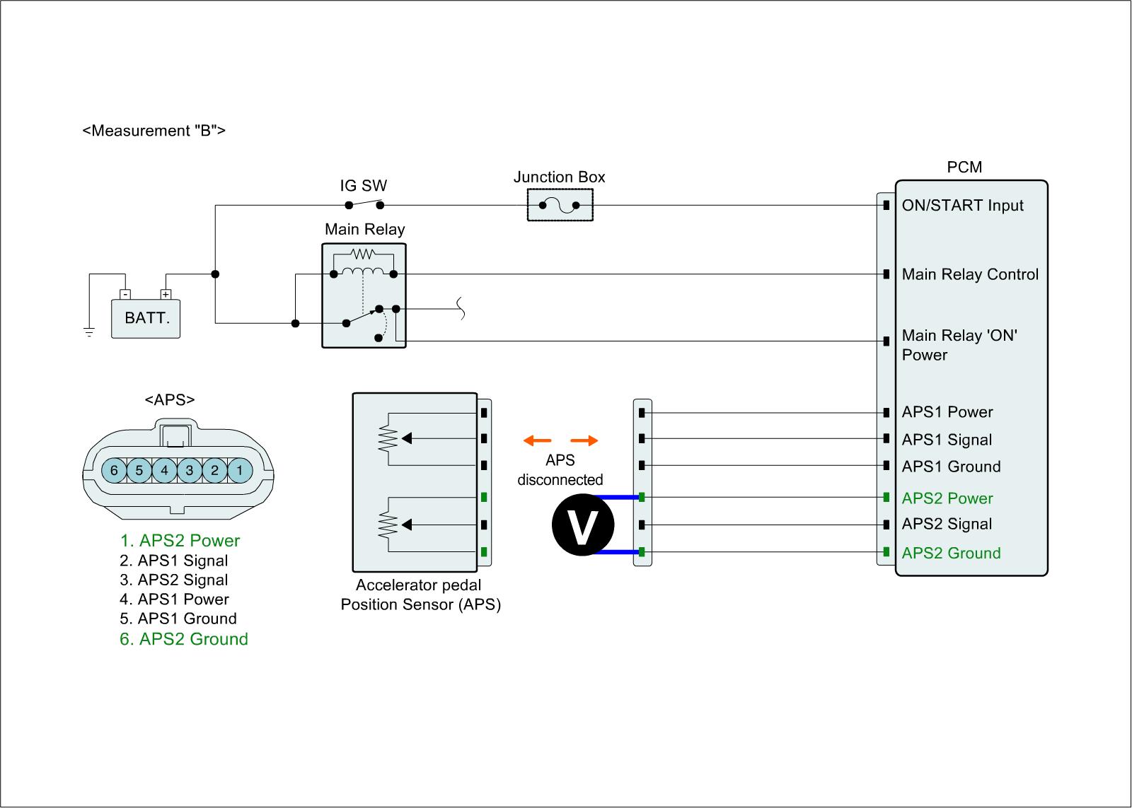 4. Measure voltage between APS 2 power and APS 2 ground terminals of APS harness connector. (Measurement "B")