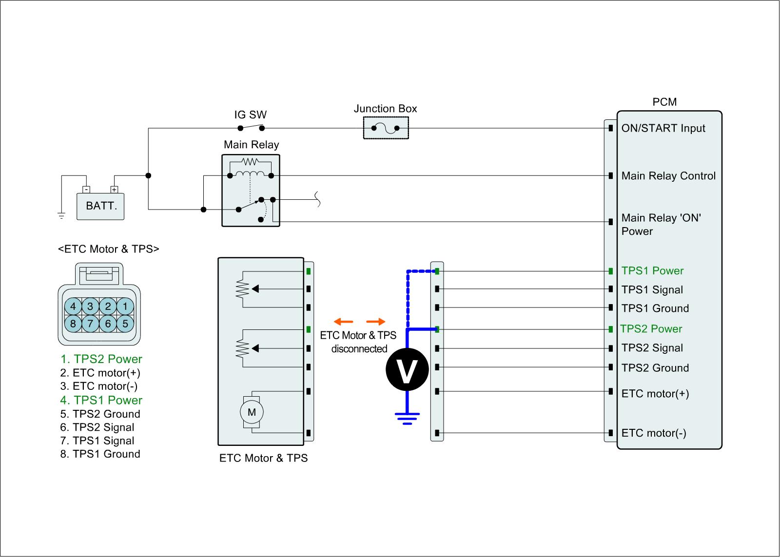 3. Measure voltage between TPS 1 (2) power terminal of ETC Motor & TPS harness connector and chassis ground.