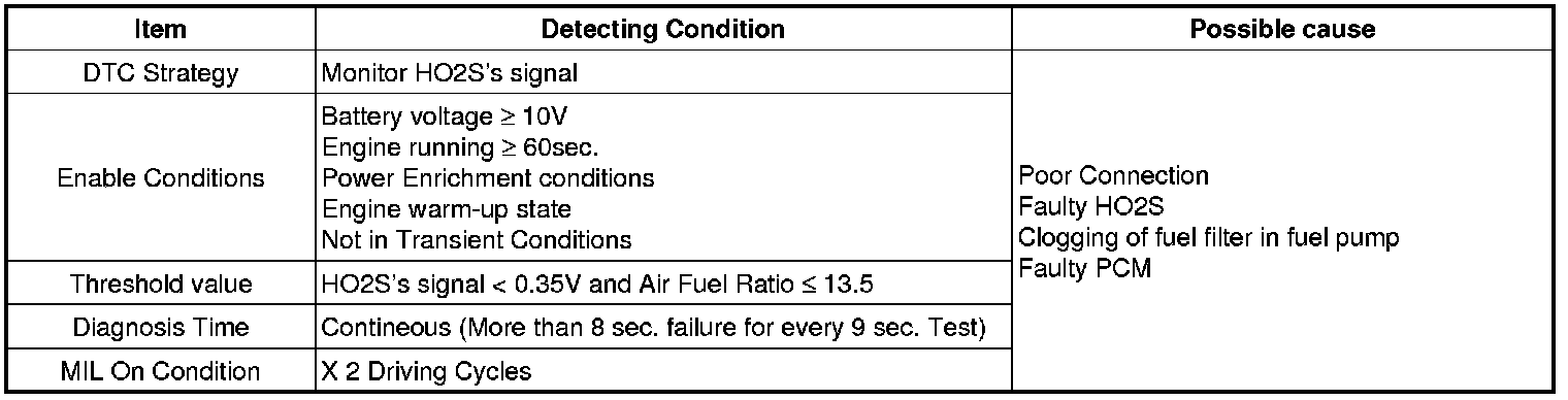 Checking output signals from HO2S under detecting condition, if HO2S's signal is lean during power enrichment conditions, PCM sets P2195. MIL (Malfunction Indication Lamp) turns on when the malfunction lasts till consecutive 2 driving cycles.