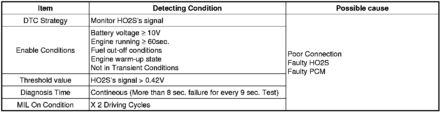 Checking output signals from HO2S under detecting condition, if HO2S's signal is rich during fuel cut-off conditions, PCM sets P2273. MIL (Malfunction Indication Lamp) turns on when the malfunction lasts till consecutive 2 driving cycles.