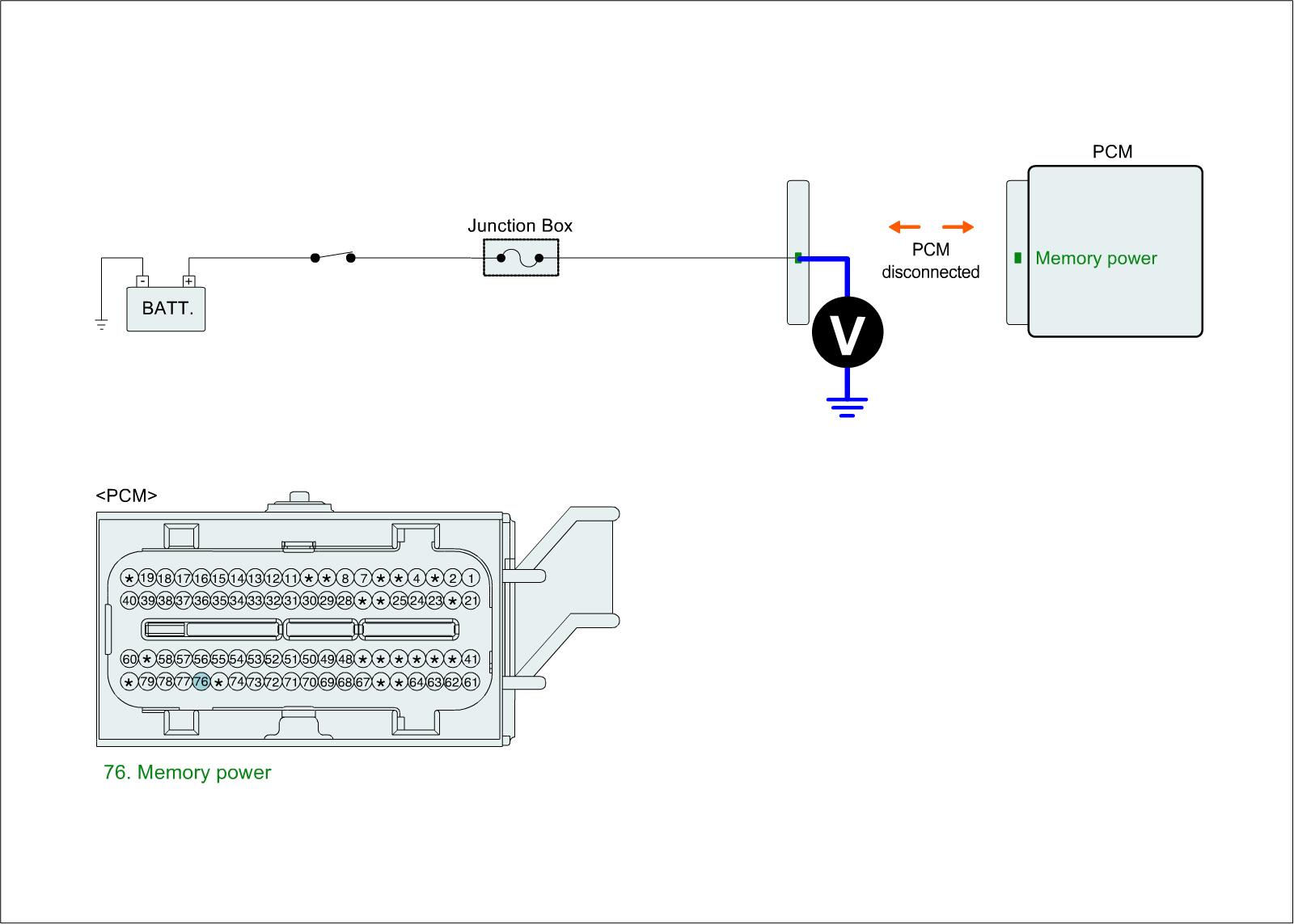 4. Measure voltage between memory power terminal of PCM harness connector and chassis ground