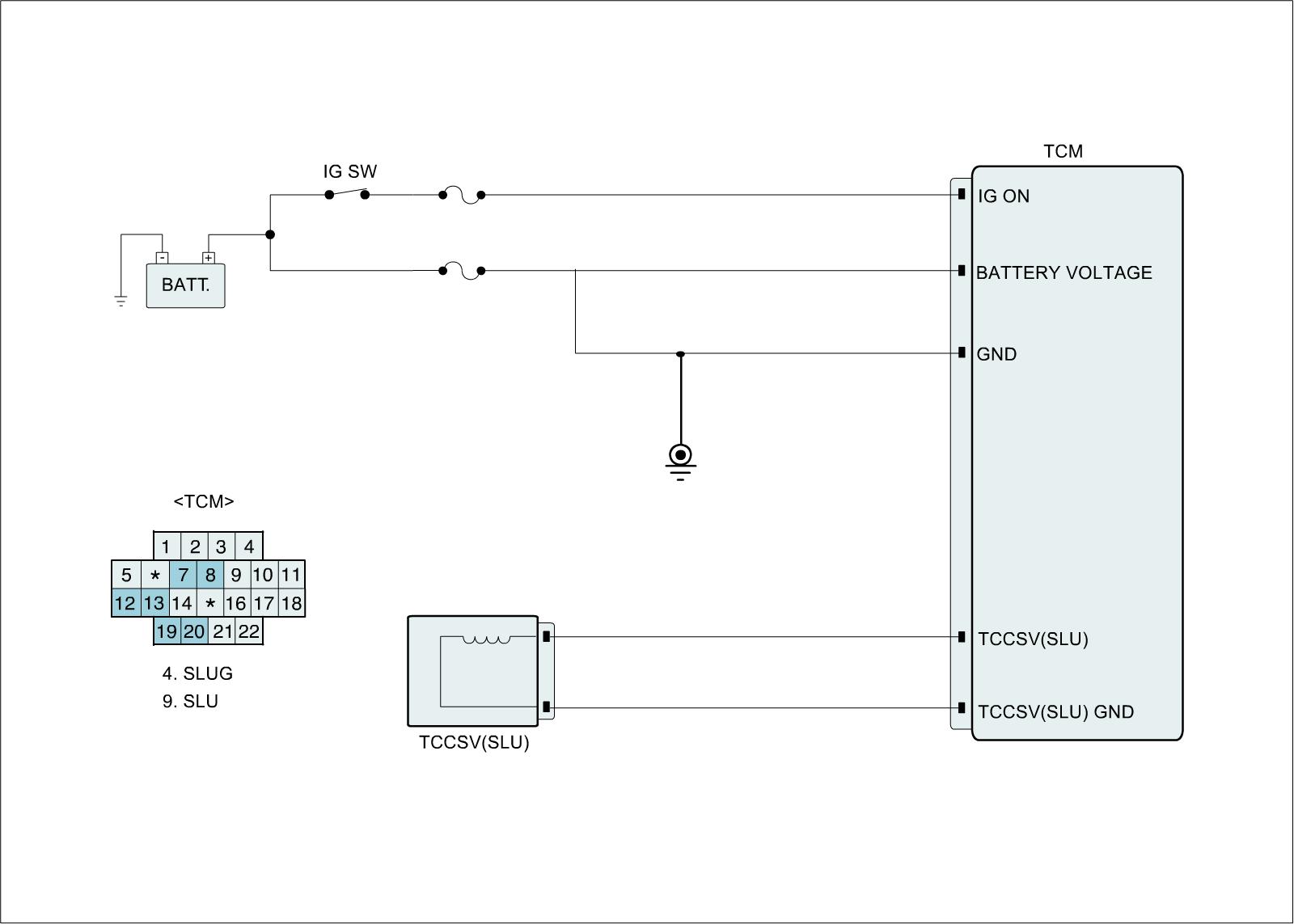The PCM/TCM controls the locking and unlocking of the Torque Converter Clutch (or Damper Clutch), to the input shaft of the transmission, by applying hydraulic pressure. The main purpose of T/C clutch control is to save fuel by decreasing the hydraulic load inside the T/C. The PCM/TCM outputs duty pulses to control the Damper Clutch Control Solenoid Valve (DCCSV) and hydraulic pressure is applied to the DC according to the DCC duty ratio value. When the duty ratio is high, high pressure is applied and the Damper Clutch is locked. The normal operating range of the Damper Clutch Control duty ratio value is from 30% (unlocked) to 85% (locked).