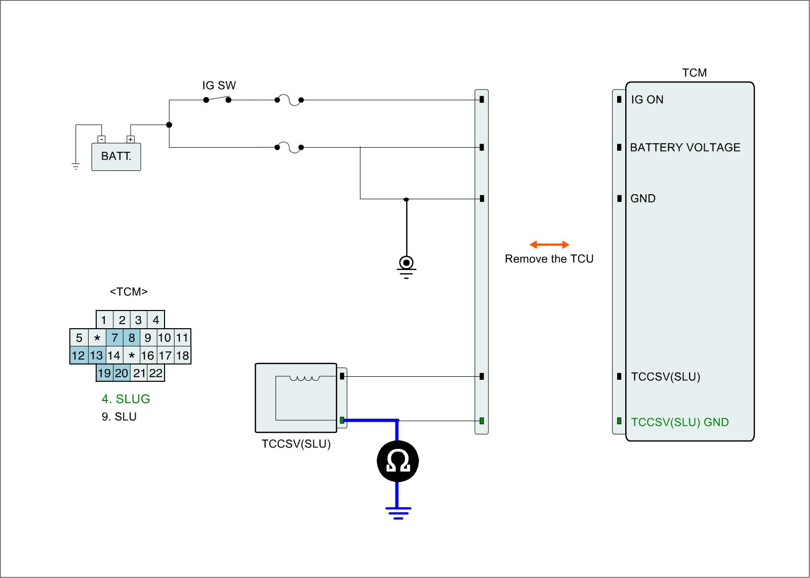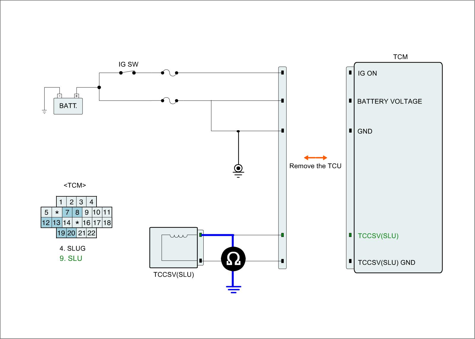 3. Perform the continuity test between "TCCSV (SLU)" terminal and chassis ground.