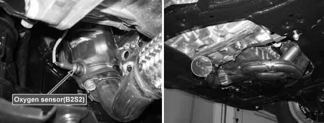 The rear heated oxygen sensor is mounted on the rear side of the Catalytic Converter (warm-up catalytic converter) or in the rear exhaust pipe, which is able to detect catalyst efficiency. The rear heated oxygen sensor (HO2S) produces a voltage between 0 V and 1 V. This rear heated oxygen sensor is used to estimate the oxygen storage capability. If a catalyst has good conversion properties, the oxygen fluctuations are smoothed by the oxygen storage capacity of the catalyst. If the conversion provided by the catalyst is low due to aging, poisoning or misfiring, then the oxygen fluctuations are similar to signals from the front oxygen sensor.