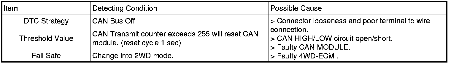 This code related to communication line between ECM (PCM, ABS, ESP) and "4WD-ECM" is set when CAN signal from ECM (PCM, ABS, ESP) can't received for more than 1 sec or ECU internal error occur. If failure is detected "4WD-ECM" prohibits the "ITCC" control and cuts the current to control coil.