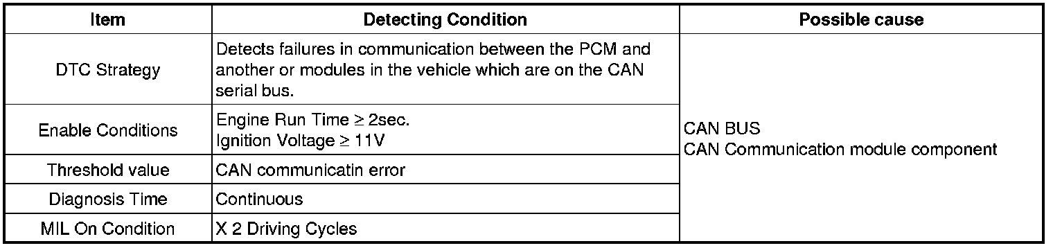 Checking CAN communication. under detecting condition, if an output signal within the detecting condition is detected for more than 1.5 sec, PCM sets U0001. MIL (Malfunction Indication Lamp) turns on when the malfunction lasts till consecutive 2 driving cycles.