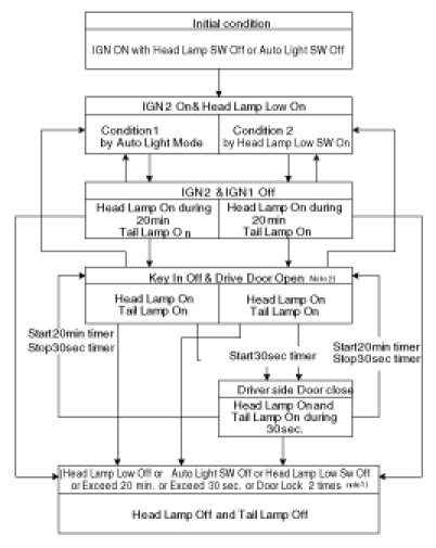 3. During active the Follow-me-home function(counting 30sec), if Driver door is re-opened, re-start 20min counter and if Driver door is re-close, re-start 30sec counter.
