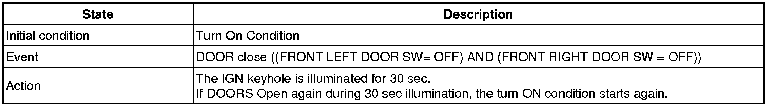 A. (While IGN KEY is inserted into the KEY CYLINDER (*) Or ACC is ON) & (IGN1 = IGN2 = ALT'L = OFF) if DRIVER SIDE DOOR is opened. KEY OPERATED WARN'G starts.