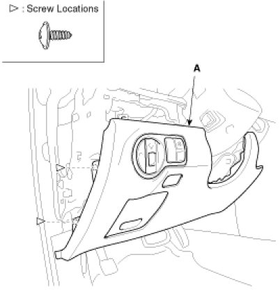 4. After loosening the mounting screws and bolts, then remove the glove box housing (A).