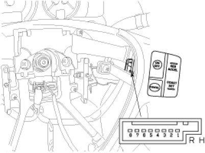 4. Disconnect the cruise control switch connector (A) and then remove the cruise control switch (C) with two screws (B).