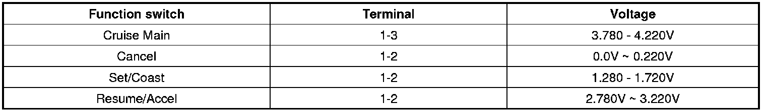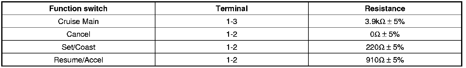 2. Measure resistance between terminals on the control switch when each function switch is ON (switch is depressed).