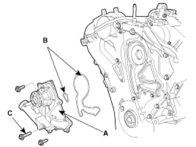 1. Install the water pump(A) and a new gasket(B) with 12 bolts.