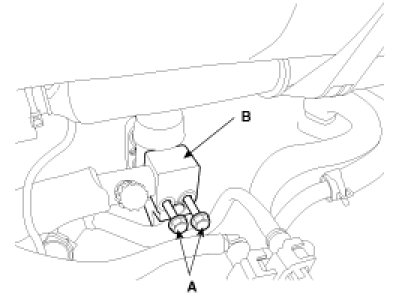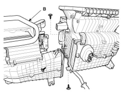 4. Remove the bolts (A) and the expansion valve (B) from the evaporator core.