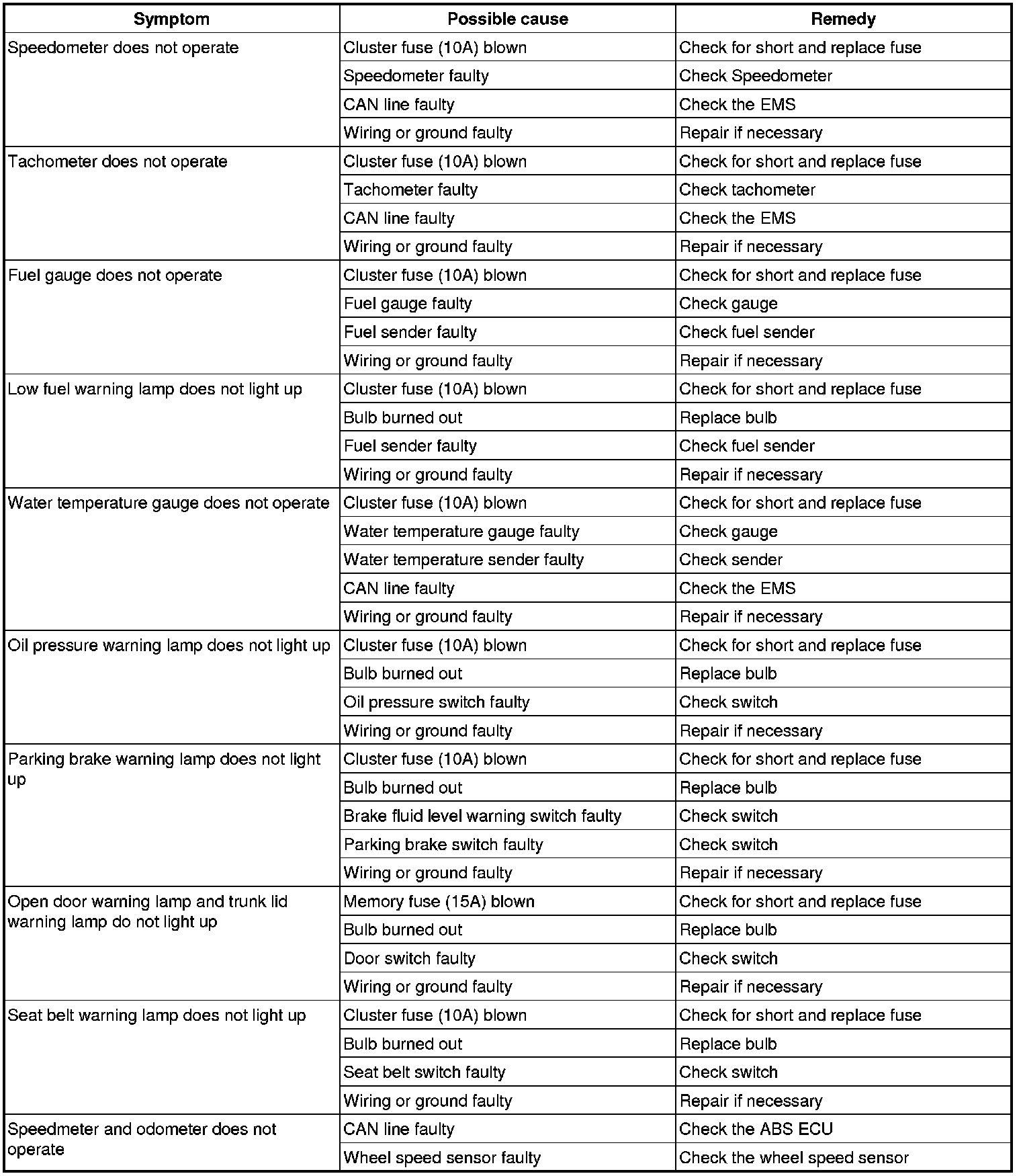 Instrument Panel, Gauges and Warning Indicators: Testing and Inspection