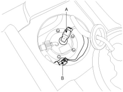 4. Disconnect the sub fuel sender connector (A) and the canister close valve connector (B).