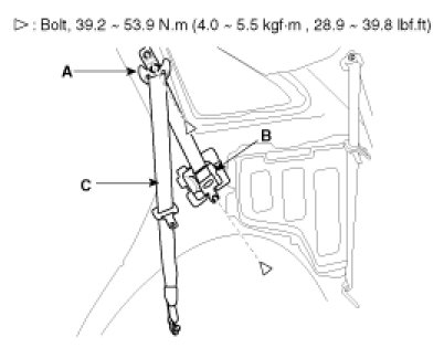 7. After loosening the retractor (B) mounting bolt, remove the rear seat belt (C).