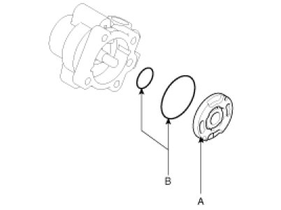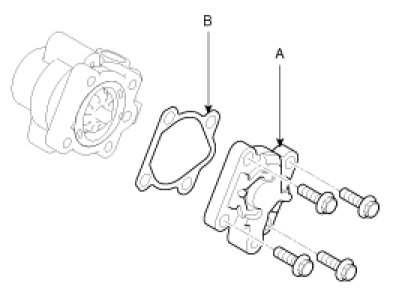 6. Assemble a new gasket (B) and pump cover (A) to the pump body and then tighten the mounting bolts.