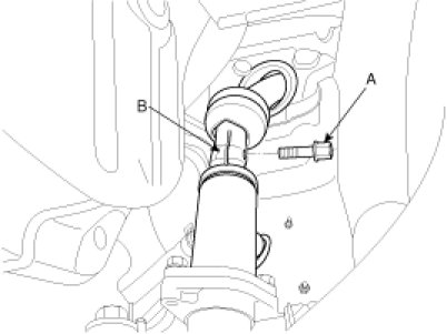 4. Loosen the bolt (A) and then disconnect the universal joint assembly (B) with the pinion of the steering gear.