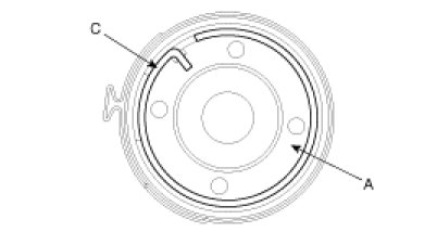 8. When the end of the clip (C) comes out of the notched hole of the housing rack cylinder, turn the rack stopper (A) counterclockwise and remove the clip.