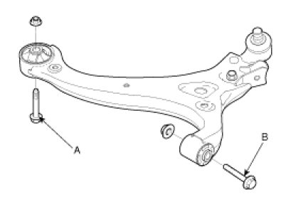 4. Loosen the bolts and nut (A, B) and then remove the lower arm from the sub-frame.