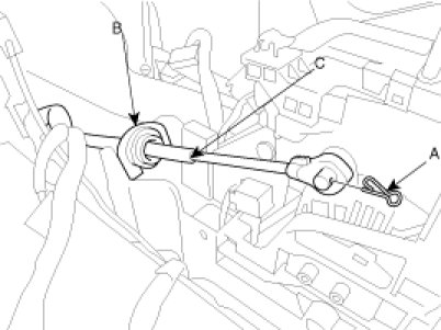 4. Install the shift cable assembly (C) by installing the clamp (A) and the snap pin (B).