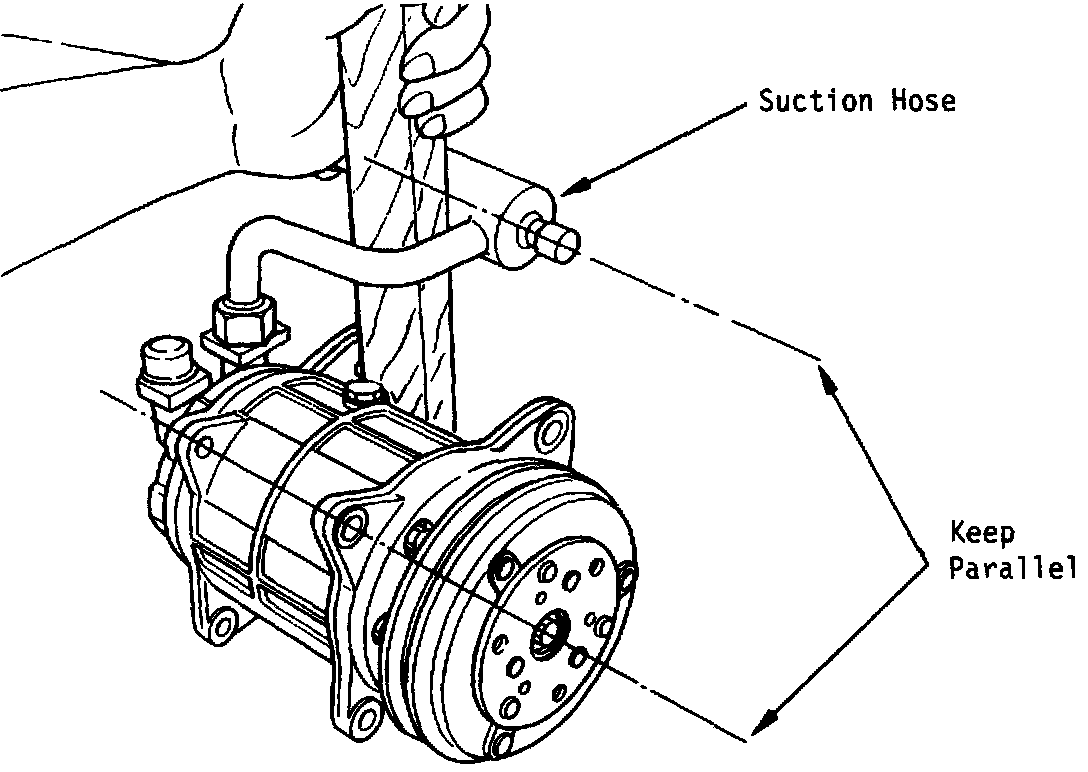 4. While holding the suction hose parallel to the compressor tighten the nut to 22-28 ft. lbs. If the suction hose is not held parallel to the compressor, it may work loose due to engine rocking and vibration resulting in loss of refrigerant.